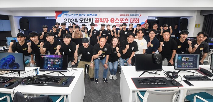 경기 오산시가 e스포츠 페스타 개최에 앞서 공직자 및 시민들의 e스포츠에 대한 관심을 높이고자 최근 '제1회 오산시 공직자 e스포츠대회'를 개최했다. 사진은 이권재 시장(앞줄 가운데)과 참가자들이 함께 기념촬영을 하고 있는 모습. (사진=오산시청 제공)