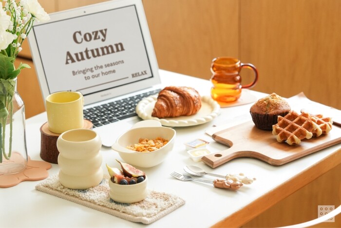 먼저 주방 테이블에 가을 무드를 담은 색상의 주방용품을 준비했다. ‘통통 블록 머그’는 브라운, 아이보리, 민트색으로 구성했으며, 코지어텀 시리즈 특유의 통통함을 컵 바디에 디자인으로 넣었다.
