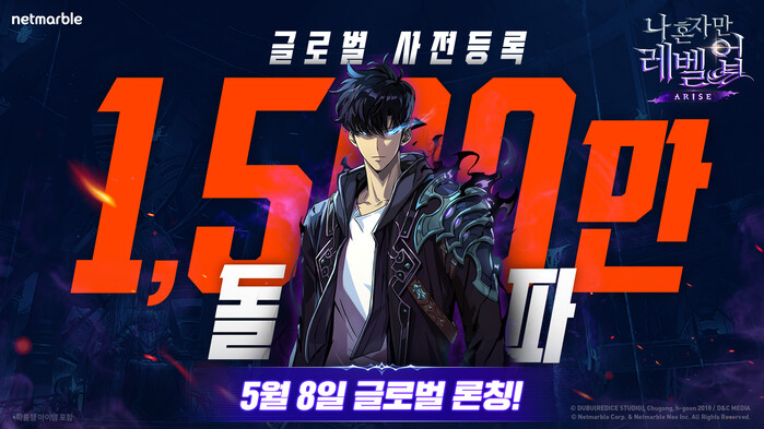 [시민일보 = 여영준 기자] 넷마블은 오는 8일 글로벌(중국, 베트남 제외) 정식출시를 앞두고 있는 신작 액션 게임 <나 혼자만 레벨업:어라이즈>의 사전등록자 수 1500만 명을 돌파했다고 7일 밝혔다.