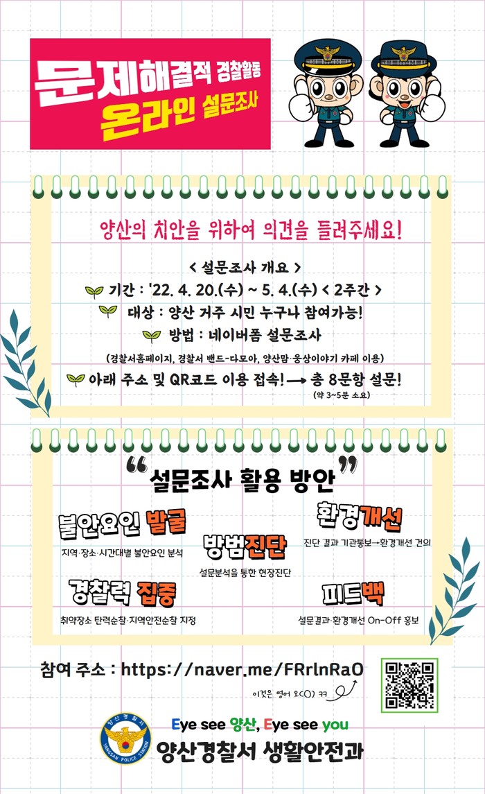 양산 시민을 대상으로 4월 20일부터 5월 4일까지 2주간에 걸쳐 온라인을 통해 실시하는 설문조사에는 양산 시민이라면 누구나 양산 경찰서 홈페이지나 자체 운영 중인 밴드(다모아) 및 20여만 명이 회원으로 가입해 활동하고 있는 지역 카페 2개 사이트를 통해 참여가 가능하다.