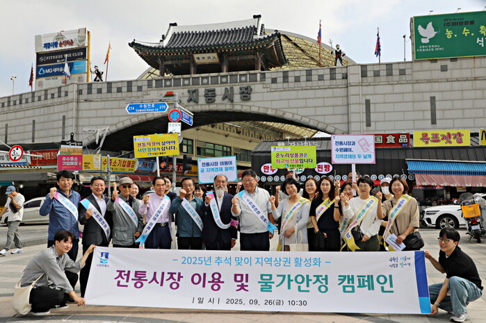 경기 수원시 팔달구는 최근 지동시장·미나리광시장·못골시장 등 지동교 일원에서 ‘2025년 추석맞이 전통시장 이용 및 물가안정 캠페인’을 진행했다. 이날 이상균 구청장, 경제교통과장 등 공직자와 전통시장 상인회, 물가모니터 요원 등이 여했다. 사진은 참석자들이 기념촬영을 하고 있는 모습. (사진=팔달구청 제공)