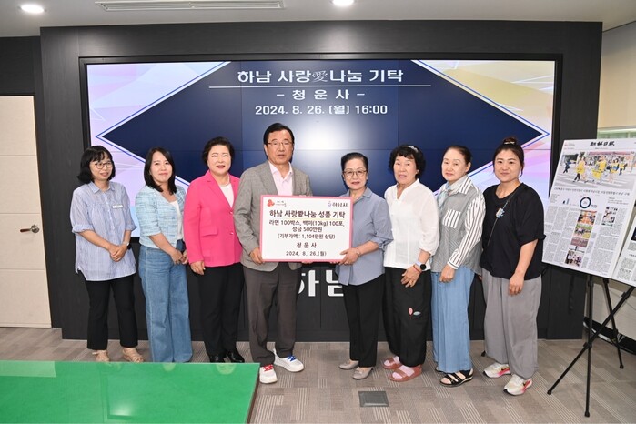청운사는 최근 하남 사랑愛나눔 성품 및 성금으로 라면 100박스, 백미 10kg 100포, 성금 500만원을 경기 하남시에 기탁했다. 성품은 감일동, 감북동, 위례동 행정복지센터 및 하남시푸드뱅크를 통해 어려운 이웃을 위한 이웃돕기 사업으로 배부될 예정이며, 성금은 14개 동 행정복지센터 취약계층에게 배분될 예정이다. 사진은 이현재 시장(왼쪽 네 번째) 및 참석자들이 기념촬영을 하고 있는 모습. (사진=하남시청 제공)
