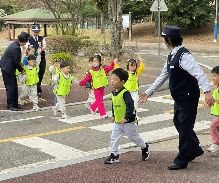 경기 과천시가 오는 5월30일까지 관문체육공원 내 어린이 교통공원에서 지역내 유치원 및 어린이집 원생을 대상으로 ‘2025년 상반기 어린이 교통안전교실’을 운영한다. 사진은 어린이들이 횡단보도 보행에 대해 배우고 있는 모습. (사진=과천시청 제공)