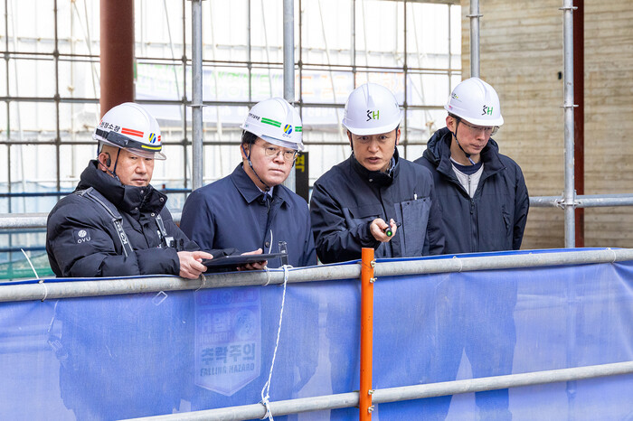 진교훈 서울 강서구청장이 최근 등촌동 ‘서울시 어울림플라자(가칭)’ 건립 현장을 찾아 공사 추진현황을 점검했다. 사진은 진 구청장(왼쪽 두 번째)이 공사 진행상황을 점검하는 모습. (사진=강서구청 제공)