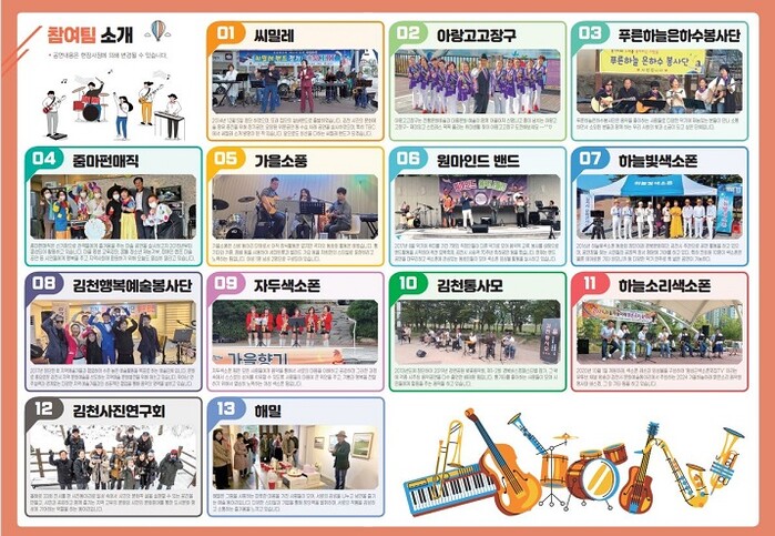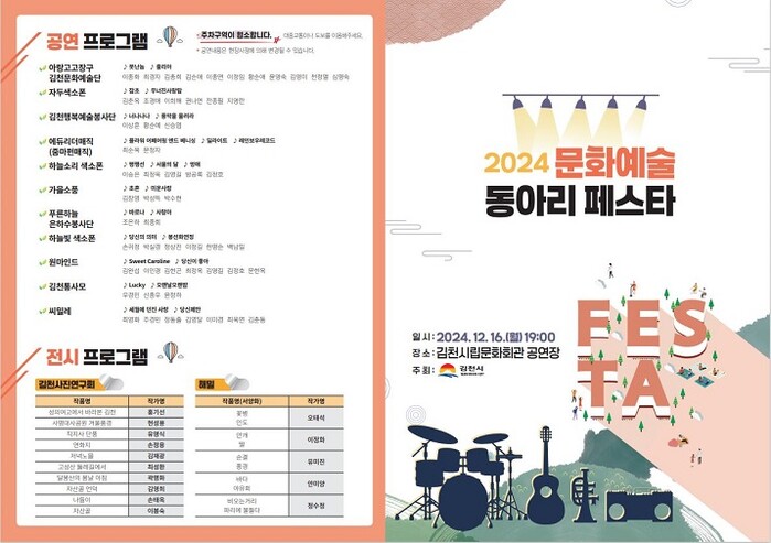 이번 2024 문화예술동아리 페스타는 ‘아랑고고장구 김천문화예술단’ 등 총 13개 팀이 참여하며, 가요, 마술 공연, 장구, 색소폰, 통기타 연주 공연과 서양화 및 사진 작품 전시 등 풍성한 내용으로 시민들에게 선보일 예정이다.