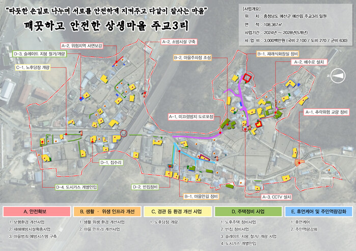 군은 총 30억원(국비 21억원ㆍ지방비 9억원)을 투자해 연면적 10만8367㎡에 ▲마을 주차장 조성 ▲보행 환경 개선사업 ▲재해 예방 시설 ▲도시가스 설치 ▲주택 정비사업 ▲휴먼케어 및 주민역량 강화 등을 추진해 지속 가능한 성장 및 상생 발전을 도모할 방침이다.
