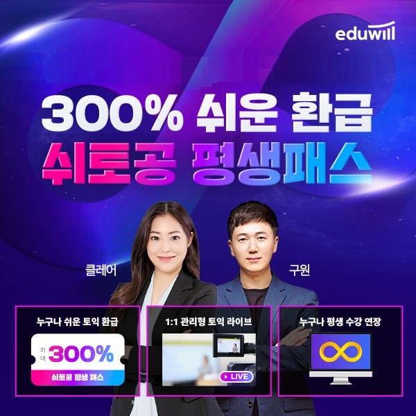 [시민일보 = 여영준 기자] 종합교육기업 에듀윌은 토익 수강생을 위한 ‘300% 환급 쉬토공 평생패스’를 진행한다고 11일 밝혔다.