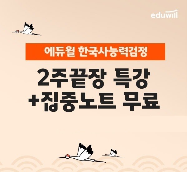 에듀윌 관계자는 "한능검 합격을 지원하는 2주끝장특강+집중노트는 에듀윌 회원이라면 누구나 만나볼 수 있다"라며 "해당 이벤트와 함께 관련 소식을 홍보하면 수강할인권, 스타벅스 아메리카노 등의 경품을 제공하는 '소문내기' 이벤트도 진행하고 있으니 많은 참여 부탁드린다"고 전했다.