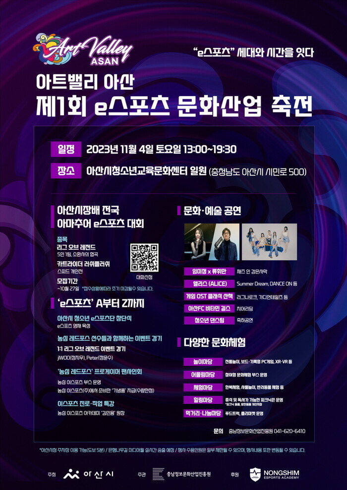 [아산=박명수 기자] 충남 아산시가 오는 11월4일 청소년교육문화센터에서 ‘아트밸리 아산 제1회 e스포츠 문화산업 축전’을 개최한다고 밝혔다.
