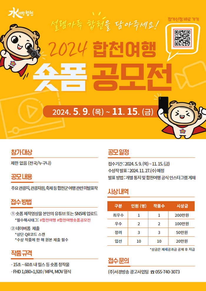참여방법은 영상 제작과 합천 관광에 관심이 있는 전국 누구나 신청 가능하며, 15초~60초 내 관광지나 축제 등 여행관련 미공개된 숏폼 영상을 #합천여행숏폼공모전#합천여행 해시태그와 함께 개인 SNS에 업로드 후 네이버폼을 통해 제출하면 된다. 1인(팀)당 1건의 작품을 제출할 수 있다.