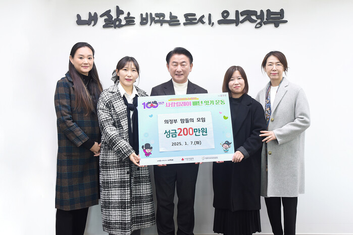 경기 의정부시가 최근 네이버 카페 ‘의정부 맘들의 모임’으로부터 신년맞이 저소득층을 위한 성금 200만원을 기탁받았다. 사진은 기탁식에서 김동근 시장(가운데)이 모임 회원들과 기념 촬영을 하는 모습. (사진=의정부시청 제공)