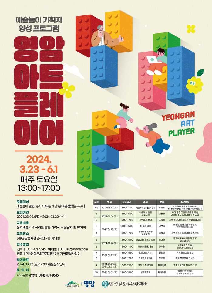 이번 교육은 오는 23일부터 6월 1일까지 매주 토요일 오후1시부터 5시까지 4시간 총 10회 차로 진행되며 ‘예술의 공간과 놀이’, ‘지역주민이 만들어가는 문화예술교육’, ‘예술 프로그램 사례 공유’, ‘프로그램 컨설팅’, ‘영암 예술놀이 키워드 발굴’, ‘예술놀이 파일럿’ 등의 프로그램으로 운영될 예정이다.