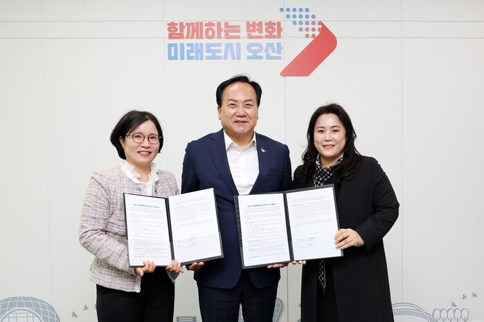 경기 오산시가 최근 지역내 국공립어린이집 2곳(시립한신더휴어린이집 및 시립대원칸타빌어린이집)과 위탁운영 위수탁계약을 체결했다. 사진은 체결식에 참석한 이권재 시장(가운데)이 관계자들과 기념 촬영을 하는 모습. (사진=오산시청 제공)