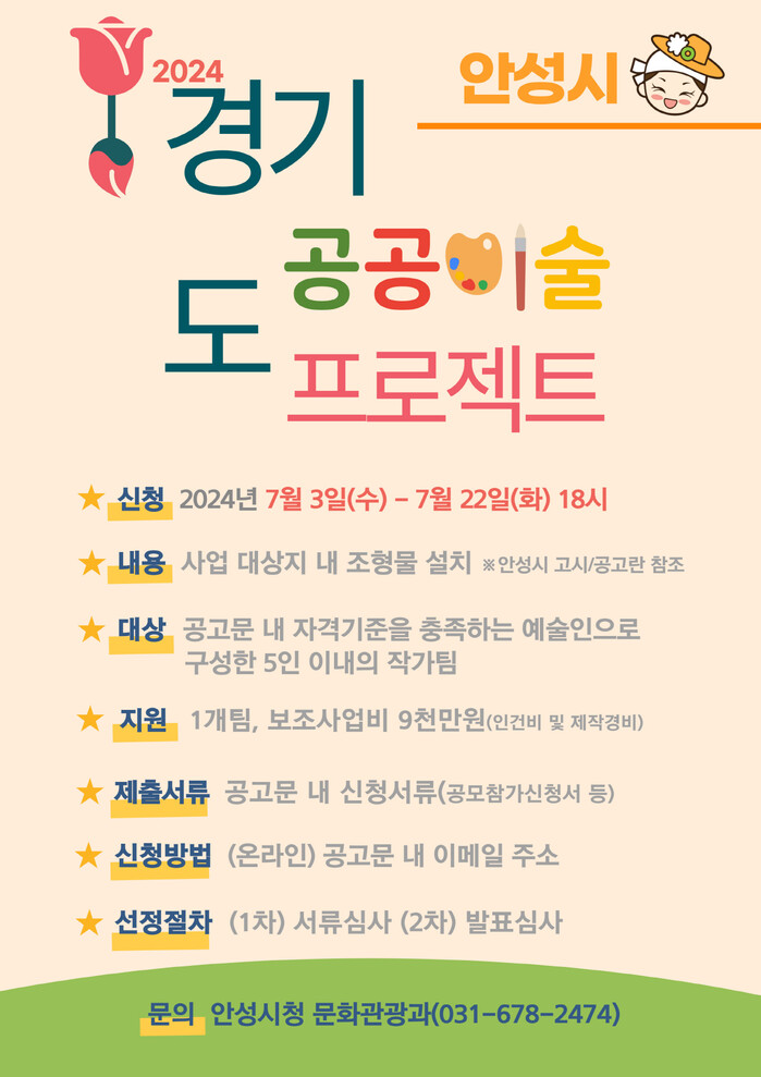 [안성=오왕석 기자] 청춘이 행복한 문화도시를 꿈꾸는 안성시가 2024년 경기도 공공미술 프로젝트를 추진할 작가팀을 모집한다.