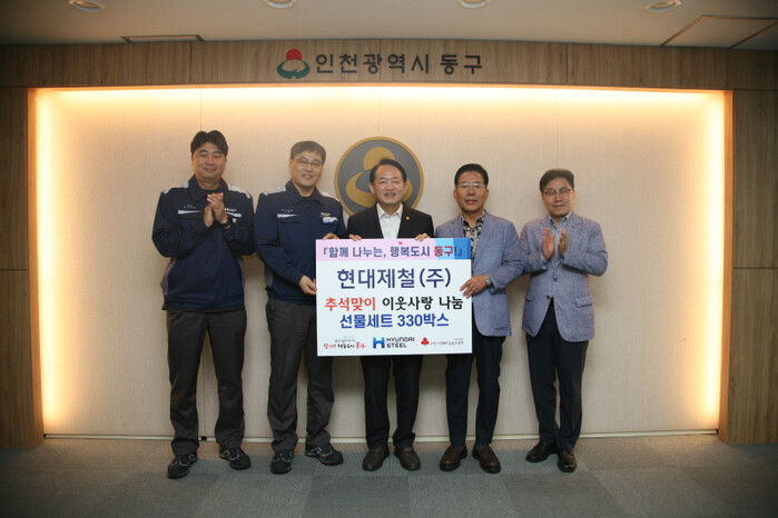 이성재 현대제철 인천공장장과 김찬진 동구청장, 조상범 인천사회복지공동모금회장이 참석한 가운데 ‘추석맞이 이웃사랑 선물 나누기’ 전달식을 가졌다.