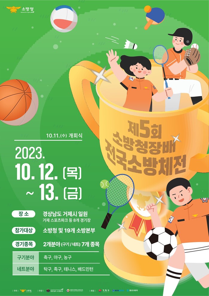 2019년부터 시작해 올해로 5회를 맞이한 소방청장배 '전국소방체전'은 12일부터 13일까지 이틀간 7개 종목(축구ㆍ야구ㆍ농구ㆍ탁구ㆍ족구ㆍ테니스ㆍ배드민턴)에 소방청 및 19개 소방본부에서 소방공무원 2500여명이 참가해 심신건강 증진과 소통ㆍ화합의 장으로 마련된다.