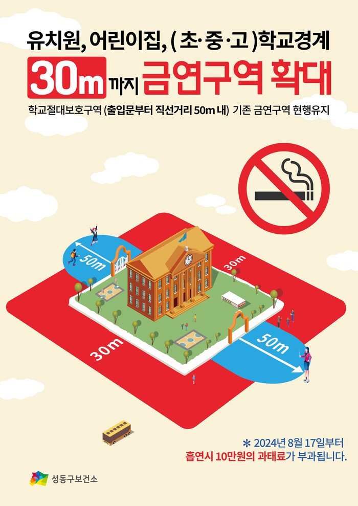 또한 초·중·고등학교 주변 30m 이내도 금연구역으로 새롭게 적용되며, 성동구 조례에 의거 운영중인 학교 출입문으로부터 반경 50m 이내(절대보호구역)도 계속해서 금연구역으로 유지된다.