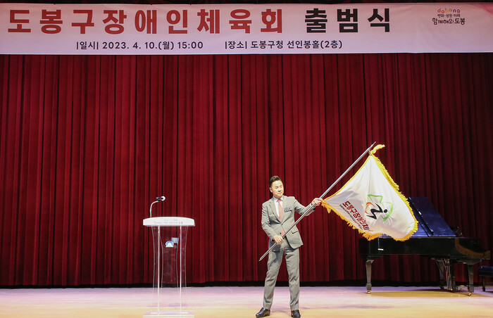 서울 도봉구는 지난 10일 ‘도봉구장애인체육회 출범식’을 했다. 출범식은 식전 공연을 시작으로 추진경과 및 2023년도 사업계획 보고 등으로 진행됐다. 사진은 오언석 구청장이 도봉구장애인체육회 출범을 알리고 있는 모습. (사진=도봉구청 제공)