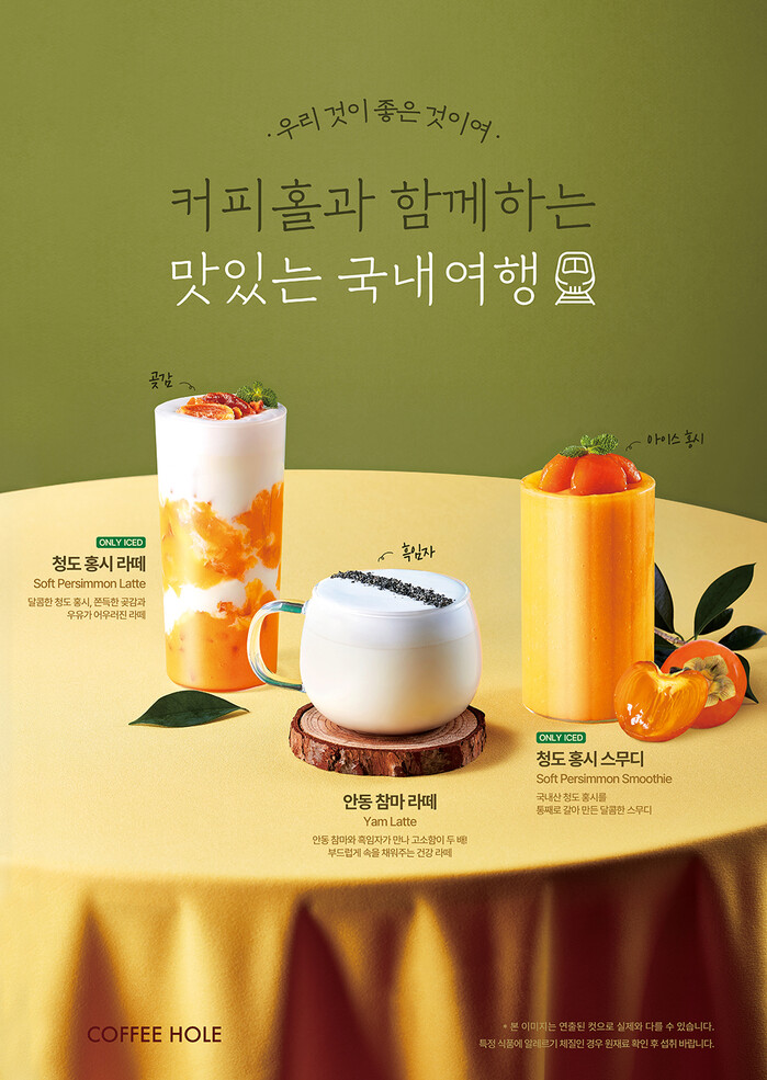 이번 출시한 시즌 메뉴는 ▲부드럽게 속을 채워주는 참마 라떼에 고소한 흑임자가 어우러진 ‘안동 참마 라떼’ ▲달콤한 홍시 라떼에 쫀득한 곶감의 식감을 더한 ‘청도 홍시 라떼’ ▲청도 홍시를 통째로 갈아 만든 달콤한 ‘청도 홍시 스무디’ 총 3종이다. 시즌 음료 3종 모두 국내산 원재료를 활용하여 건강하게 즐길 수 있는 음료로 개발한 점이 특징이다.