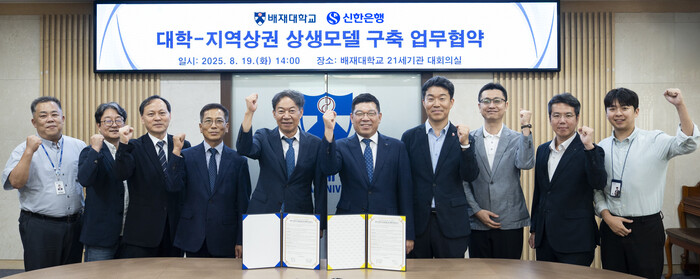 | ▲ 지난 19일 대전광역시 서구 소재 배재대학교에서 ‘대학-지역상권 상생모델 구축 업무협약’을 체결하고 정태용 신한은행 대전세종본부장(오른쪽 다섯번째)과 김욱 배재대학교 총장(오른쪽 여섯번째) 및 관계자들이 기념촬영하는 모습 |