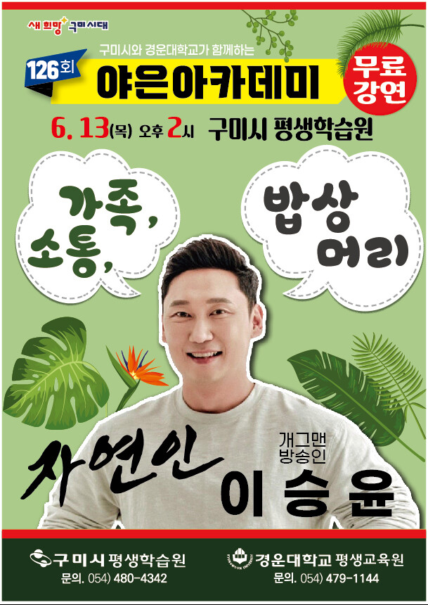 [구미=박병상 기자] 경북 구미시가 오는 13일 평생학습원 대강당에서 개그맨 이승윤의 ‘가족, 소통, 밥상머리 특강’이라는 주제로 '제126회 야은아카데미' 무료 강연을 개최한다.