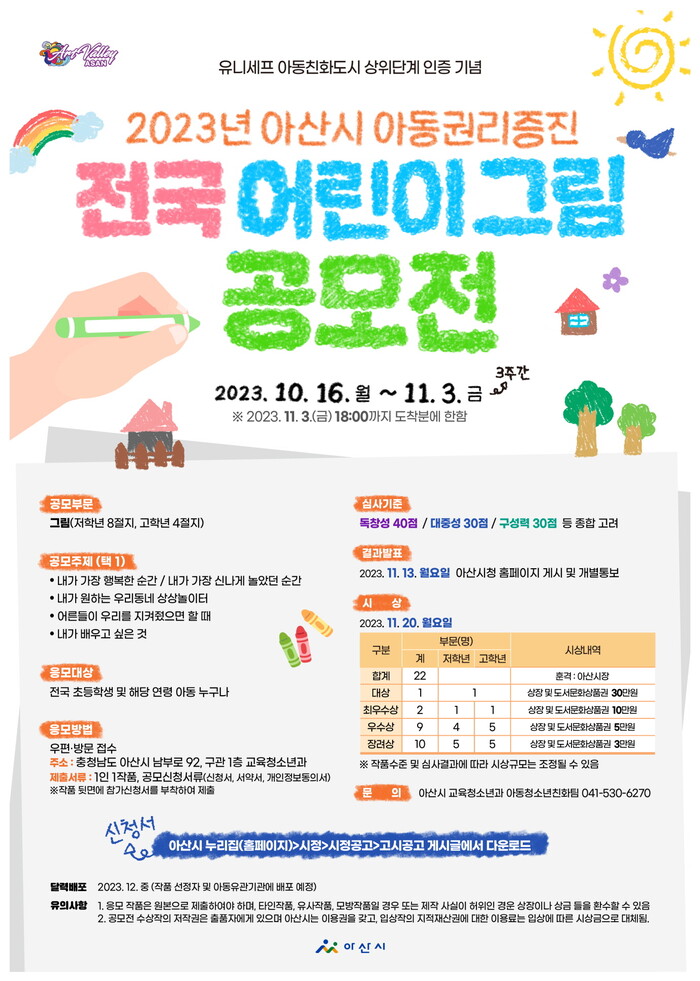 [아산=박명수 기자] 충남 아산시가 ‘2023년 아산시 아동권리증진 그림 공모전’을 개최한다.
