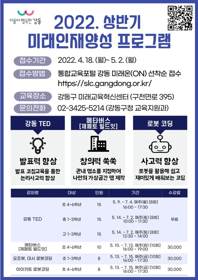 | ▲ 2022. 상반기 미래교육혁신센터 미래인재양성 프로그램 홍보물 (사진제공=강동구청) |