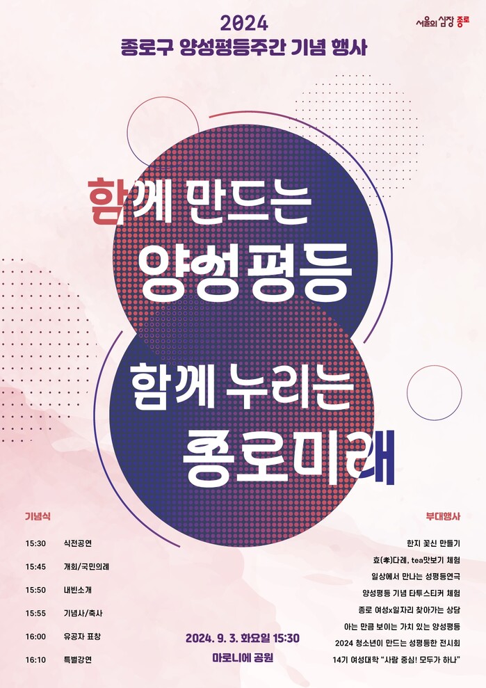 [시민일보 = 이대우 기자] 서울 종로구(구청장 정문헌)가 오는 9월3일 마로니에공원에서 ‘2024 양성평등주간 기념 행사’를 개최한다.