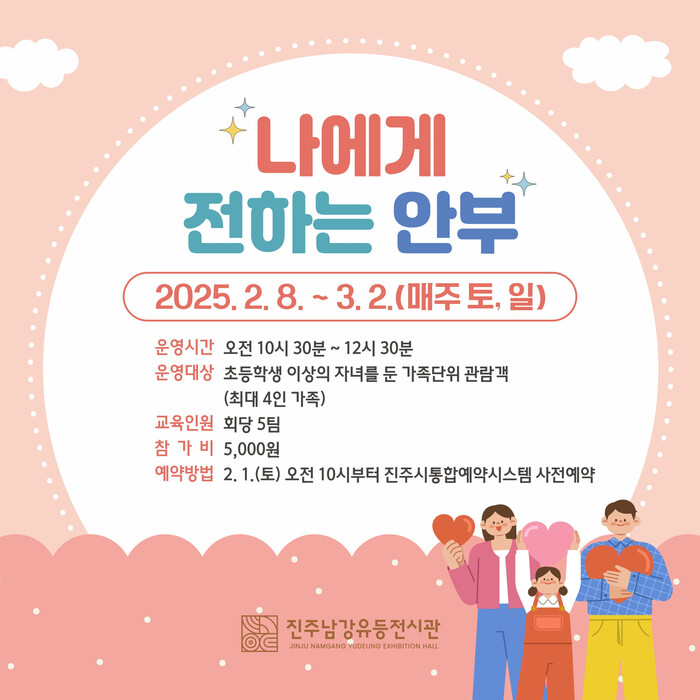 사전예약은 2월 1일 오전 10시부터 진주시통합예약시스템을 통해 선착순으로 가능하며, 자세한 사항은 진주남강유등전시관 누리집을 참고하거나 전화로 문의하면 된다.