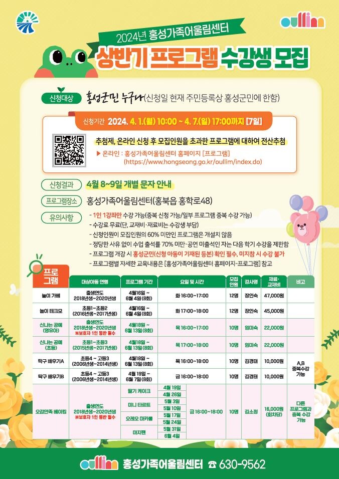 모집기간은 1일 오전 10시부터 7일 오후 5시까지로, 홍성가족어울림센터 홈페이지에서 온라인 접수로만 가능하다.