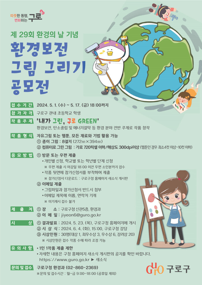 이번 공모전 주제는 ‘내가 그린, 구로 GREEN'으로, 환경보전, 탄소중립, 에너지 절약 등 환경 분야에 대한 자신만의 생각을 자유롭게 그림 등으로 표현하면 된다.