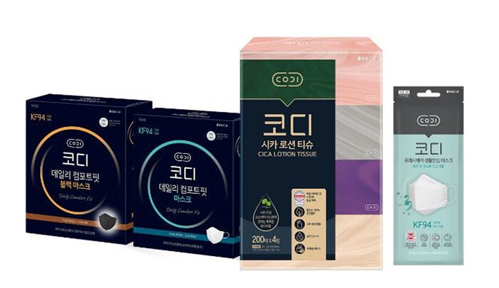 | ▲ <사진 : (왼쪽부터) ‘코디 데일리 컴포트핏 마스크’, ‘코디 시카 로션 티슈’, ‘코디 프레시에어 생활안심 마스크’> |