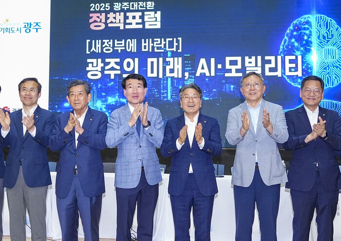 [광주=정찬남 기자] 강기정 광주광역시장(오른 쪽부터 두 번째)이 8일 오후 동구 전일빌딩245에서 열린 '광주의 미래, AI모빌리티 정책포럼'에 참석해 내빈들과 기념촬영을 하고 있다./광주광역시 제공