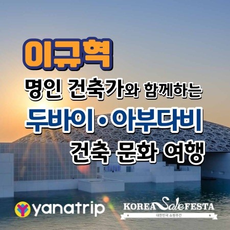야나트립이 이번에 행사에서 소개하는 여행 상품은 '건축가 이규혁과 함께하는 두바이, 아부다비 건축 문화 여행'이다. 이번 2022 코리아 세일 페스타를 통해 구매하는 고객은 두아비 및 아부다비 건축 문화 여행의 진행자이자 <한옥 자연을 닮다>의 저자인 이규혁 건축가와 2023년 1월 초에 창덕궁 투어의 기회와 함께 친필 사인이 담긴 책자를 제공받을 수 있다.