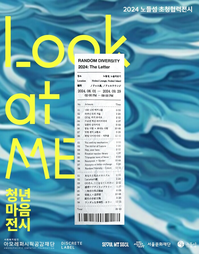 [시민일보 = 이대우 기자] Look at ME ‘청년 마음 전시’ <랜덤 다이버시티 2024 : 더 레터>는 지난 5월 아모레퍼시픽공감재단과 서울문화재단이 체결한 '노들 컬처 클러스터' 업무협약에 따른 노들섬 초청 협력 전시로, 8월 1일부터 9월 29일까지 노들섬 노들라운지에서 진행한다. 이번 전시는 뉴미디어 아트 레이블 ‘디스크리트 레이블’과 협업해 체험형 전시로 선보이며, 생성형 AI(Generative AI)’와 ‘편지(The Letter)’라는 전통적 커뮤니케이션의 교집합에서 진정한 마음 공감을 표현한다.