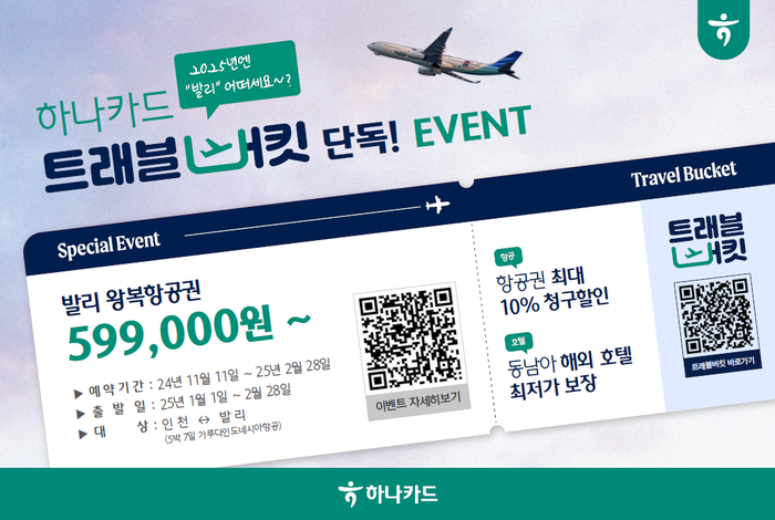 구체적으로 하나카드 ‘트래블버킷’에서 국제선 항공권 구매 시 하나카드 전월 실적에 따라 최대 10% 청구할인을 받을 수 있으며, 최대 할인을 받을 경우 발리 왕복항공권을 유류세 포함 59만9000원에 구매할 수 있다.