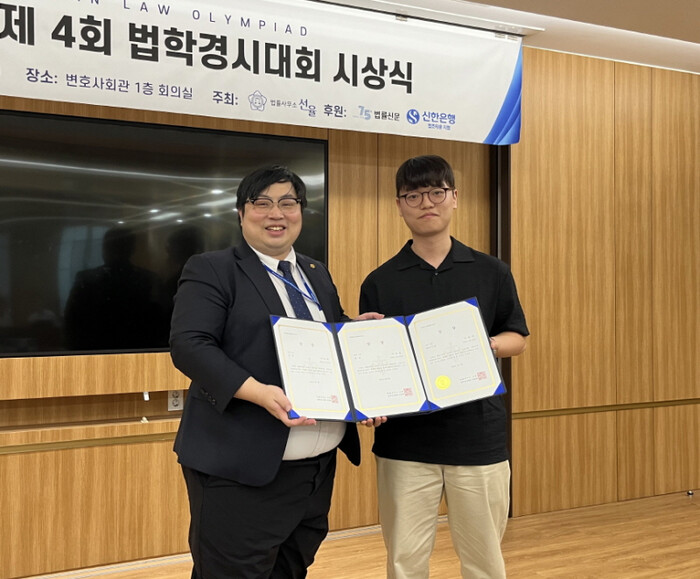 | ‘2025년 제4회 법학 경시대회’에서 종합 부문 최우수상을 수상한 인천대 법학부 이승관 학생(오른쪽)이 기념촬영을 하고 있다. |