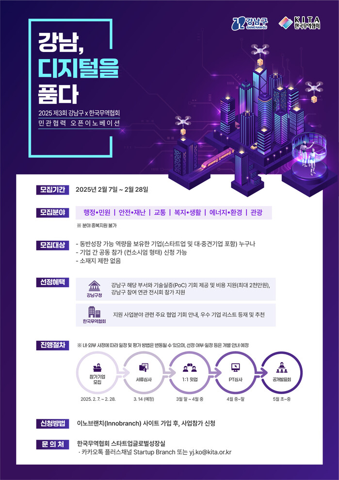 [시민일보 = 이대우 기자] 꿈이 모이는 도시, 미래를 그리는 강남구(구청장 조성명)가 한국무역협회와 함께 민관협력 오픈 이노베이션 제3회 ‘강남 디지털을 품다’를 추진, 2월 7일부터 28일까지 참가 기업을 모집한다.