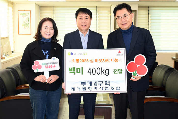 [인천=문찬식 기자] 인천 부평구는 5일 부개4구역주택재개발정비사업조합(이하 조합)으로부터 2026년 설 이웃사랑 나눔 성품으로 백미 400kg을 전달받았다.