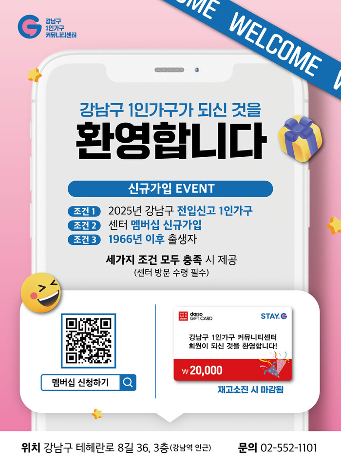 아울러 1966년 이후 출생자 중 올해 강남구 전입신고를 마친 1인가구에게는 선물로 생활용품을 구입하는 데 쓸 수 있도록 다이소 상품권 2만원권을 증정한다. 센터 멤버십 신규 가입 후 센터로 방문하면 수령할 수 있다.