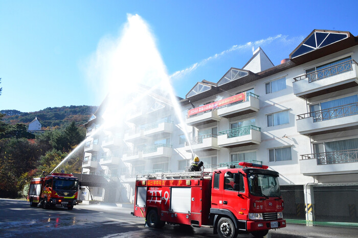 | ▲ 무주덕유산리조트 가족호텔 진달래동에서 소방훈련 하는 모습. (사진=부영그룹 제공) |