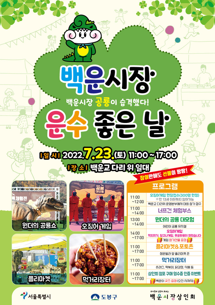 [시민일보 = 박준우 기자] 서울 도봉구(구청장 오언석) 쌍문1동 백운시장 일대에서 오는 23일 '백운시장 운수좋은 날, 공룡이 습격했다!' 축제가 열린다.