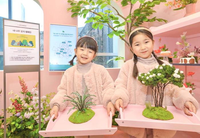 | ▲ 26일 오전, 서울시 양천구 현대백화점 목동점 7층 보타닉 하우스에 마련된 ‘서울마이트리-내 나무 갖기’ 팝업스토어에서 캠페인에 참여한 아이들이 식재할 나무 모형을 들고 포즈를 취하고 있다. (사진=현대백화점 제공) |