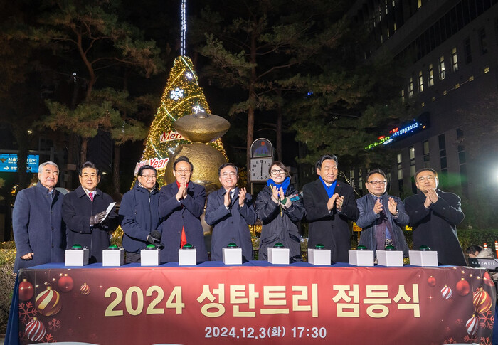 서울 강서구가 최근 구청 앞마당에서 연말을 맞아 ‘성탄트리 점등식’을 개최했다. 사진은 점등식에 참석한 진교훈 구청장(가운데)이 참석들과 기념촬영을 하고 있는 모습. (사진=강서구청 제공)
