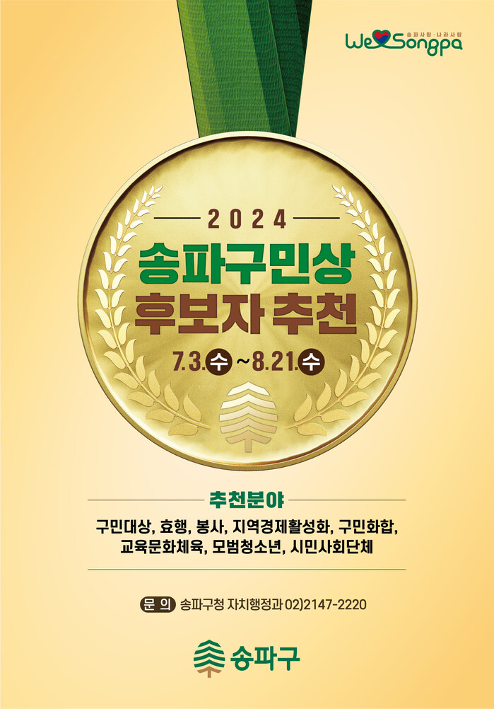 추천된 후보자는 송파구 구민상심사위원회의 엄격한 심사를 거쳐 선정되며, 오는 9월 송파구민의 날 기념행사에서 시상할 예정이다.