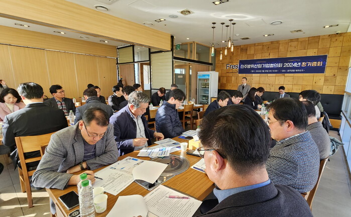진주시와 진주방위산업기업협의회(회장 홍수훈)는 지난 28일 충무공동 소재 식당에서 방산 관련 중소기업, 경남테크노파크, 한국산업기술시험원(KTL) 등 관계자 40여 명이 참석한 가운데 ‘2024년 진주 방위산업기업협의회 정기총회 및 방산기업 지원사업 설명회’를 개최했다.