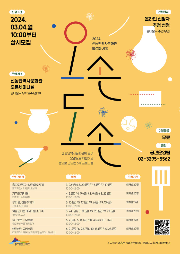 운영시간은 매주 금요일 오전 10시부터 낮 12시까지(슬기로운 나무생활은 오후 1시)로 상세 일정 및 내용은 동대문구문화재단 누리집과 인스타그램에서 확인할 수 있다.