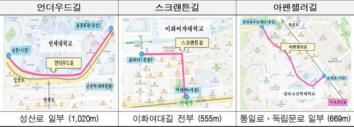 구간은 ▲‘언더우드길’이 연세대학교 앞 성산로 일부(1,020m) ▲‘스크랜튼길’이 이화여자대학교 앞 이화여대길 전 구간(555m) ▲‘아펜젤러길’이 감리교신학대학교 앞 통일로 일부 및 독립문로 일부(총 669m)다.