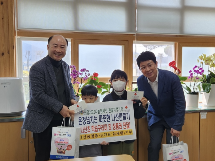 환영식에서는 나산면사무소는 아이들에게 상품권과 학용품을 전달하며 따뜻한 환영의 마음을 전했다. 아이들의 입학 선물은 ‘희망2025 나눔캠페인’의 일환으로 나산공영중기의 후원금으로 진행됐다.
