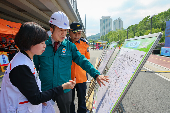 서울 서초구가 대규모 재난대응 역량을 강화하고 통합 대응체계를 점검을 위해 최근 양재천·여의천 합수부에서 ‘2025년 재난대응 안전한국훈련’을 실시했다. 사진은 훈련에 참여한 전성수 구청장(가운데)이 관계자들과 상황을 점검하는 모습. (사진=서초구청 제공)